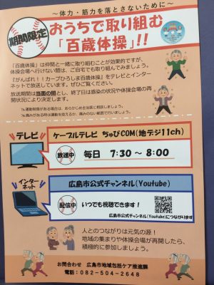 ケーブルテレビやYouTubeで「百歳体操」が視聴できるようです。