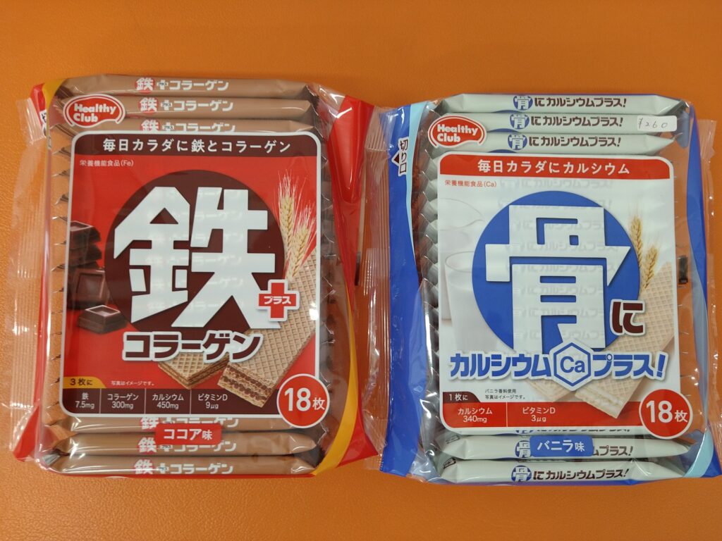 鉄+コラーゲンウエハースと、カルシウムウエハースです。18枚入り各260円。