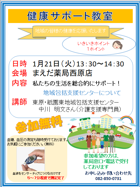 まえだ薬局西原店1月健康教室開催日程 投稿日 2019年12月24日 更新日 2026年1月22日 著者 5ssol カテゴリー 日記 広島市の調剤薬局グループ 株式会社ファインプラスまえだ薬局西原店 令和2年、年明けのの健康教室は1月21日(火)に開催します。会場:まえだ薬局西原店時間:13:30~14:30 今回は『東原・祇園東地域センター』の介護支援専門員の方に来ていただきお話しをしていただきます。予約を受け付けております。参加希望の方はお電話かご来局ください。 投稿 Threads