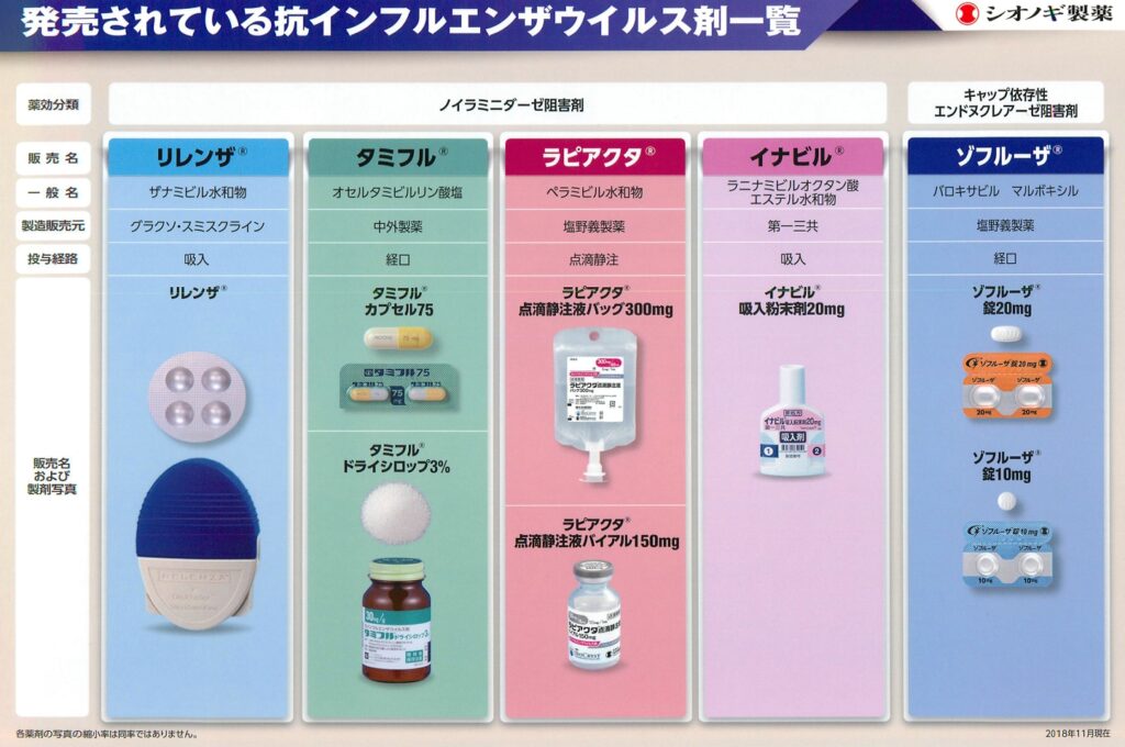 飲み薬としてタミフル(オセルタミビル)・ゾフルーザ、吸入薬としてリレンザ・イナビル、点滴としてラピアクタがあります。