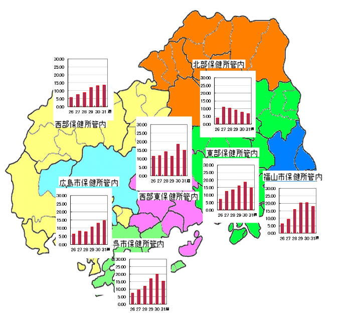 保健所別では、西部、広島市保健所管内で定点当たり報告数が、前週(第30週)より増加しました。
