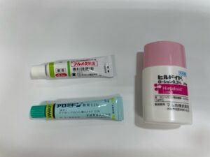 保湿のローションと荒れがひどい時の軟膏、落ち着いてきたら塗る軟膏です。