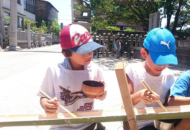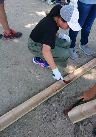 竹を切りそうめんレーンやそうめんを食べる入れ物や箸を作ります。箸は細い竹をカッターナイフで削って作ります。いつもは騒がしい子供たちが一言も発せず集中して作っていました。
