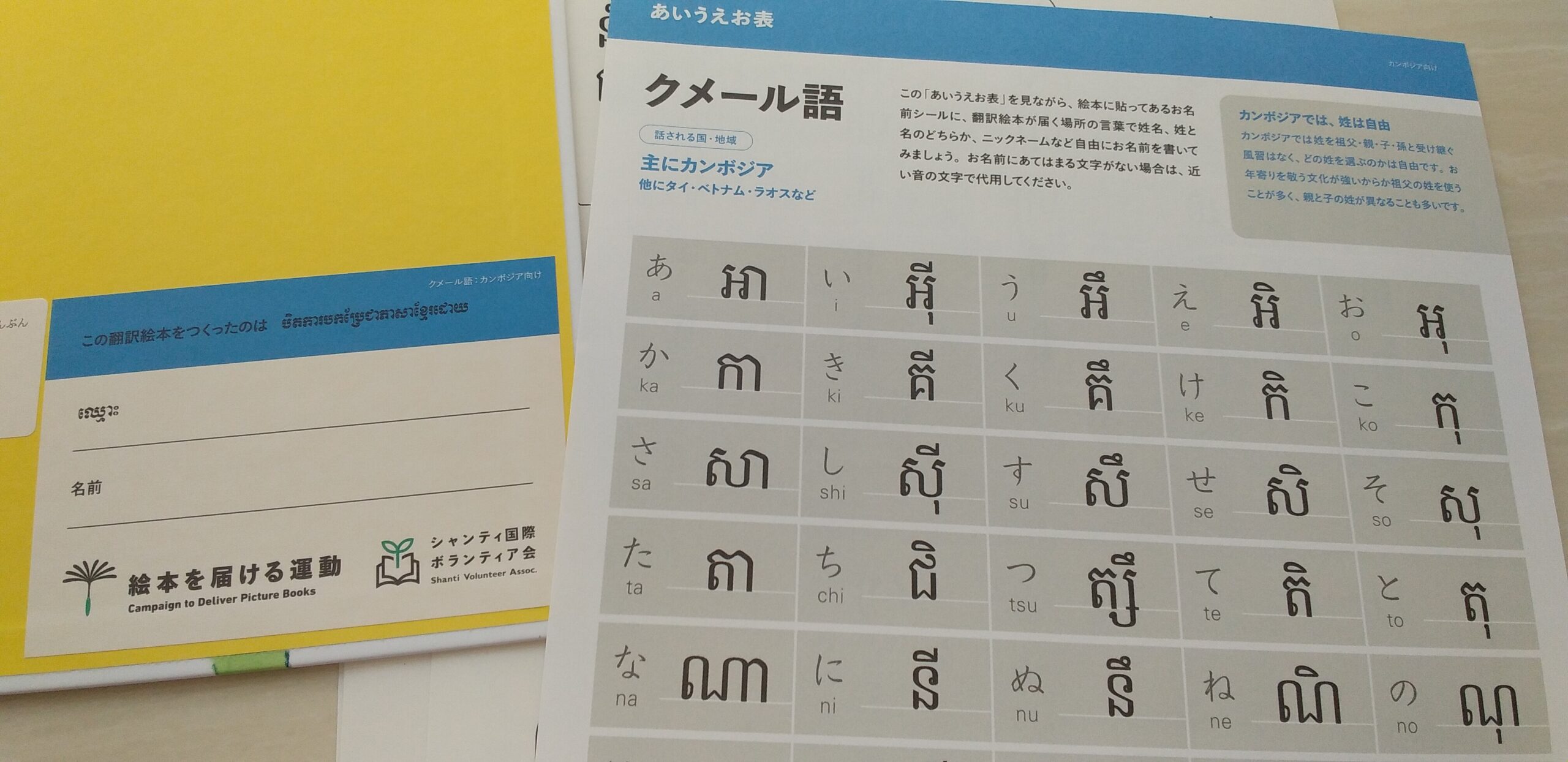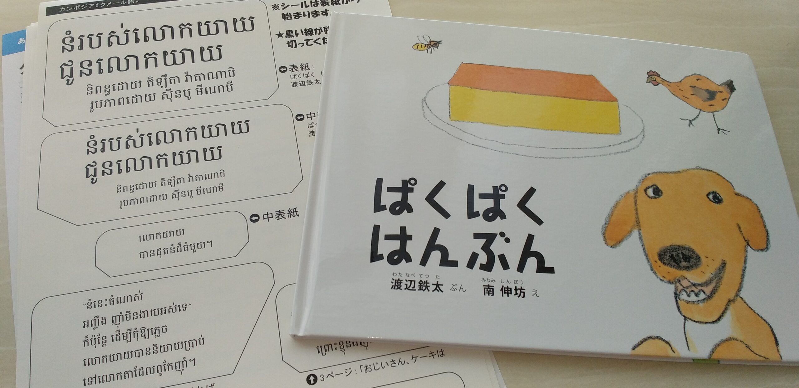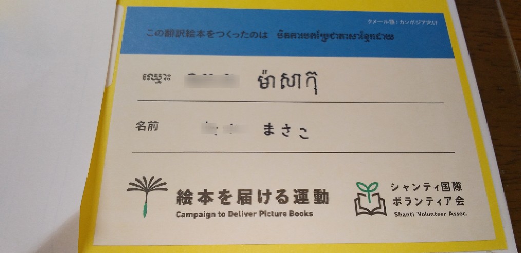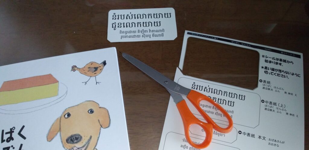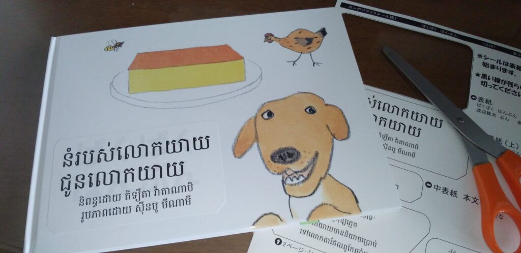 参加費を払うと、絵本や翻訳シールなどが届きます。今回私の担当はカンボジアに届ける絵本。クメール語です。