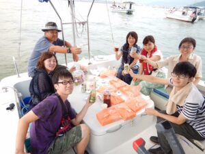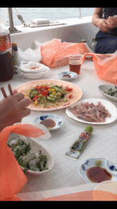 船の上でおいしいお弁当と、お刺身を食べながら始まるのを待ちます!