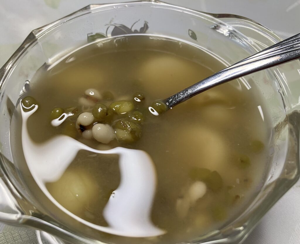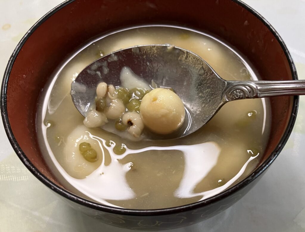 暑さピーク時期だったので、体の熱を冷ましたり浮腫みをとってくれる緑豆やハトムギ、蓮の実はまさにこの時期にぴったりの食材なんです。冷たいのと温かいバージョンで食べ比べしました。