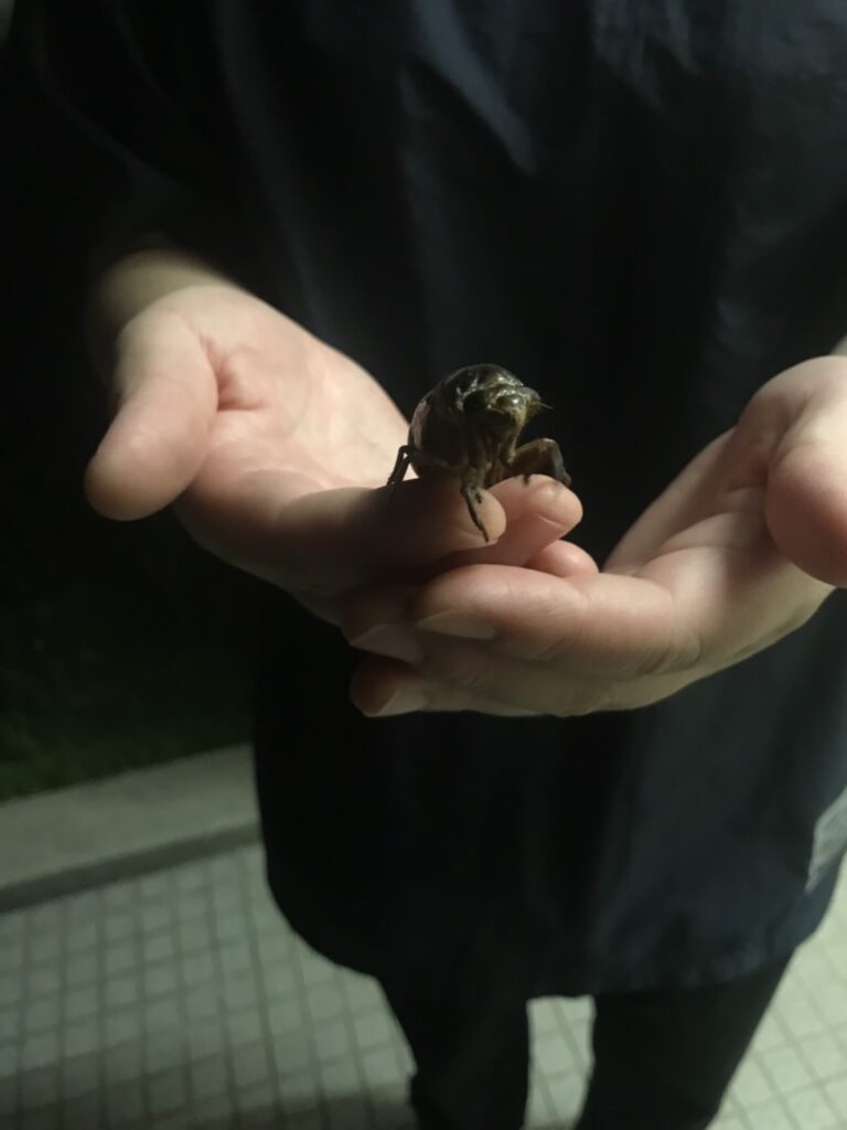 私の子たちは蝉のさなぎを見ても蝉だと分からないと思い 蝉のさなぎを自宅へ持って帰ろうかなとも思ったのですが、せっかく土の中から出てきたのに・・・と思い近くの木に返しました。