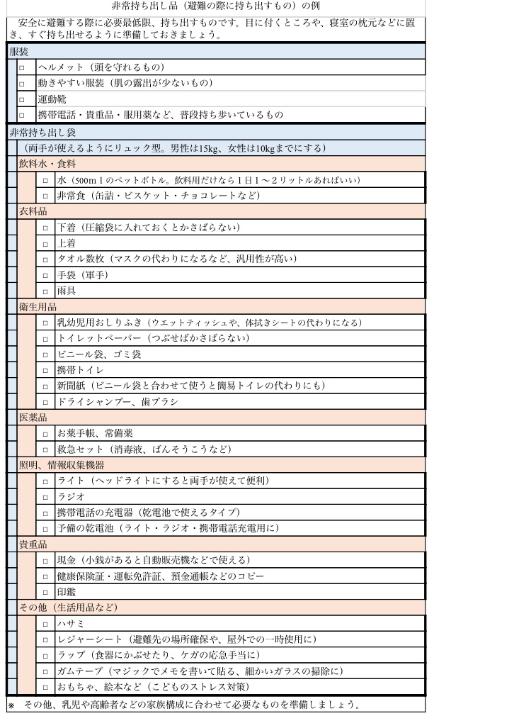 広島市のホームページより避難時に持ち出すものリストを確認しました。