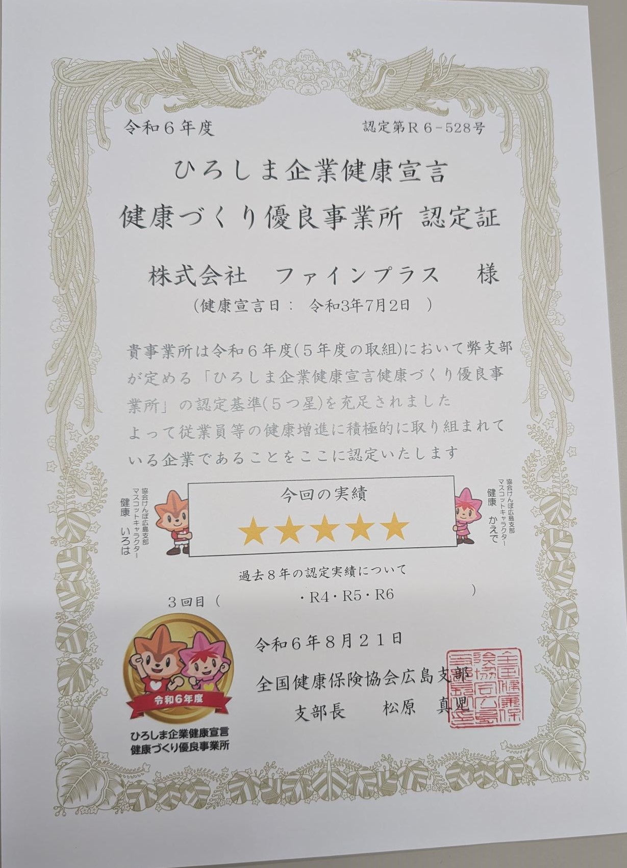 3年前に社労士さんのご紹介で協会けんぽ広島支部が取り組んでいる「ひろしま企業健康宣言」にエントリーして今年やっとゴールド認定をいただくことになりました!!